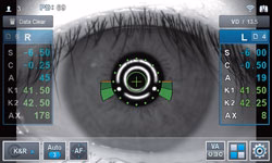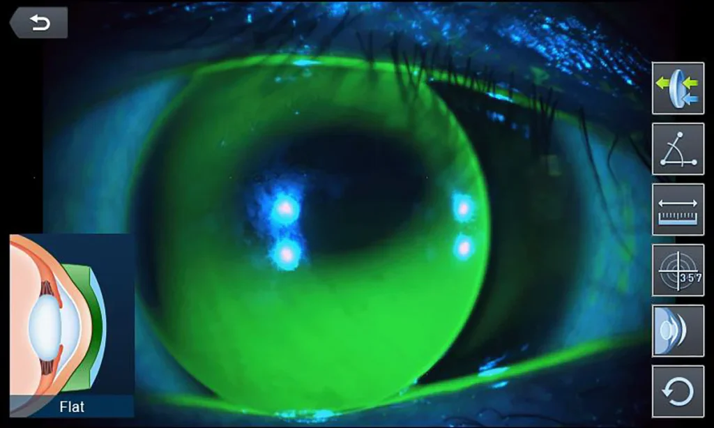 La primera función de adaptación de lentes de contacto del mundo en un auto refractoqueratómetro le permite ver el líquido de fluoresceína con iluminación azul.