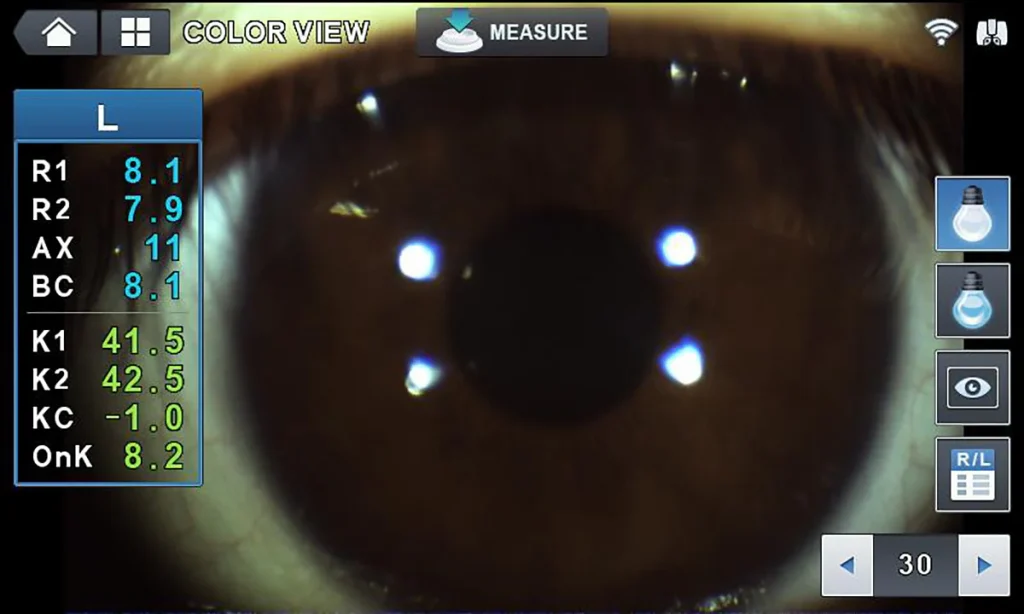 La medición continua en la periferia de la córnea a 90˚ tanto vertical como horizontalmente desde el centro de la córnea produce valores de curvatura y excentricidad de todos los puntos y permite el mejor ajuste de lentes de contacto.