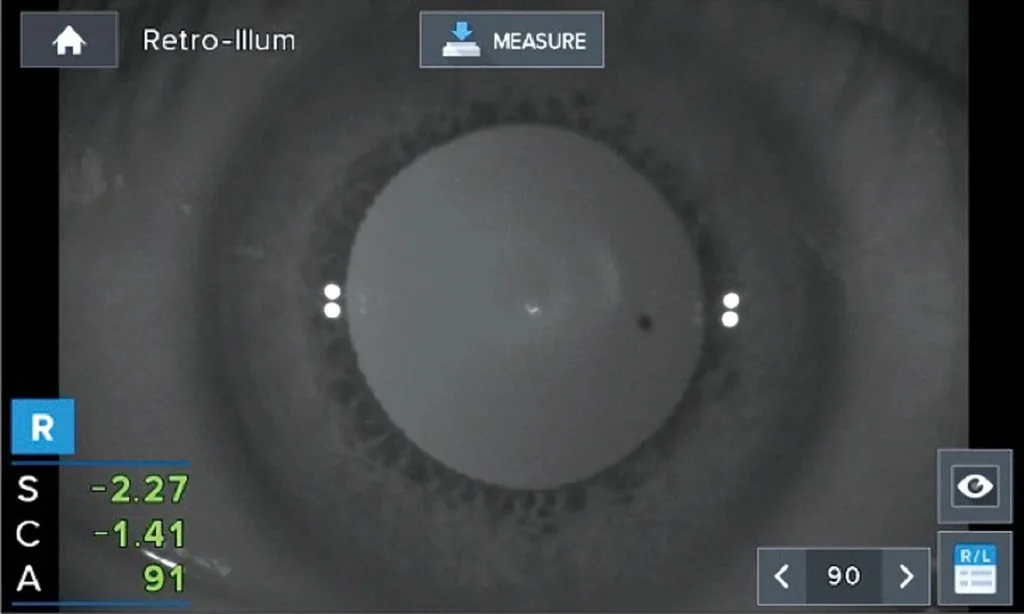 Es posible capturar y ajustar imágenes de contraste mientras se monitorea. En el caso de las lentes RGP, esta función calcula automáticamente y muestra los datos del radio de curvatura de la base de la lente. Además, los usuarios pueden evaluar la pendiente y la planitud después de la adaptación de lentes rígidas.