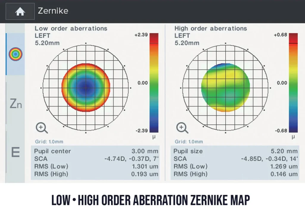 El Mapa de Zernike y el Gráfico pueden mostrarse en 2D y 3D para que los usuarios puedan entender fácilmente los datos de Esfera, Cilindro, Eje y Aberración de alto orden.
