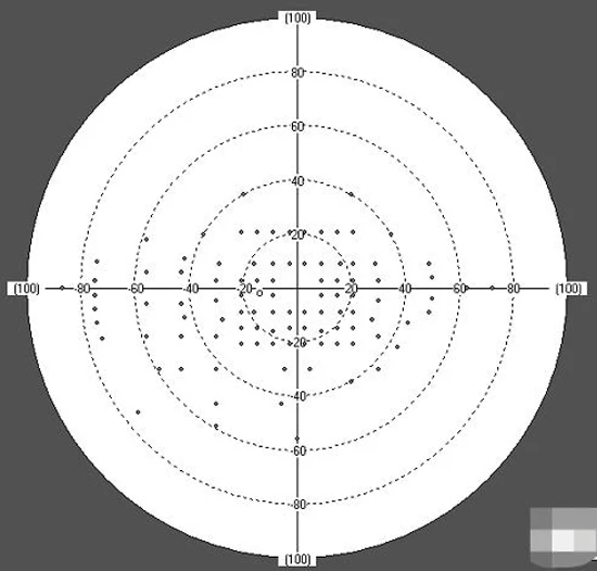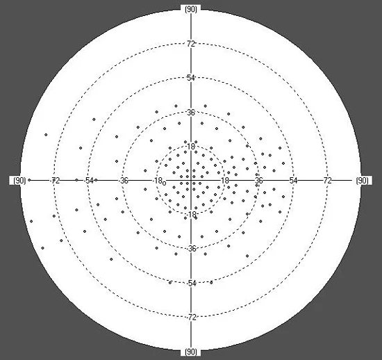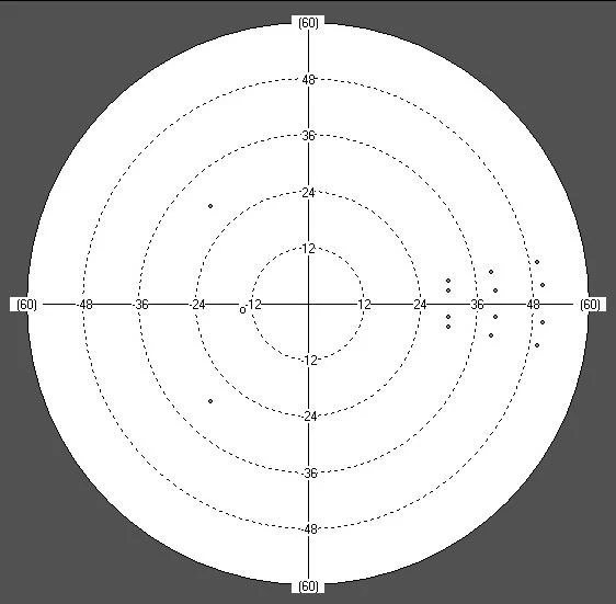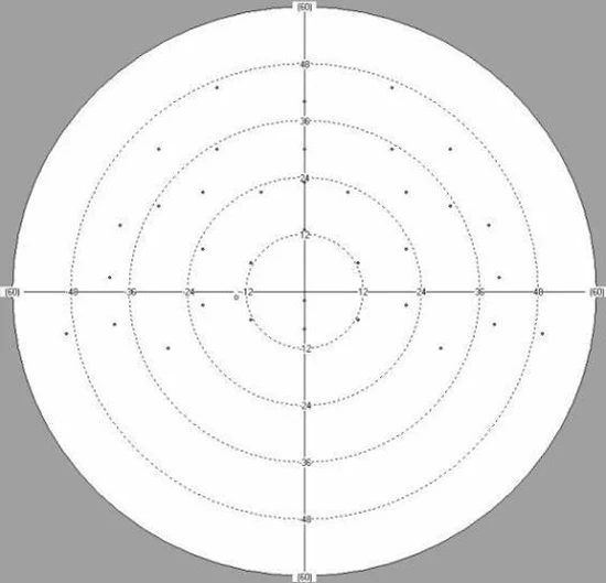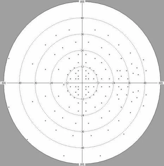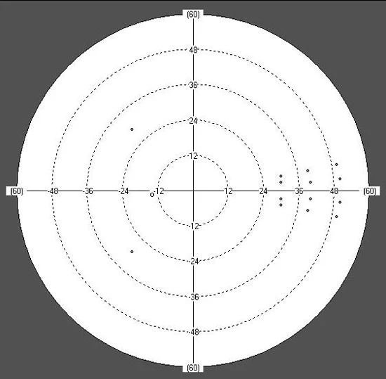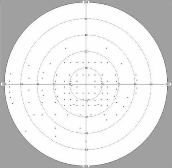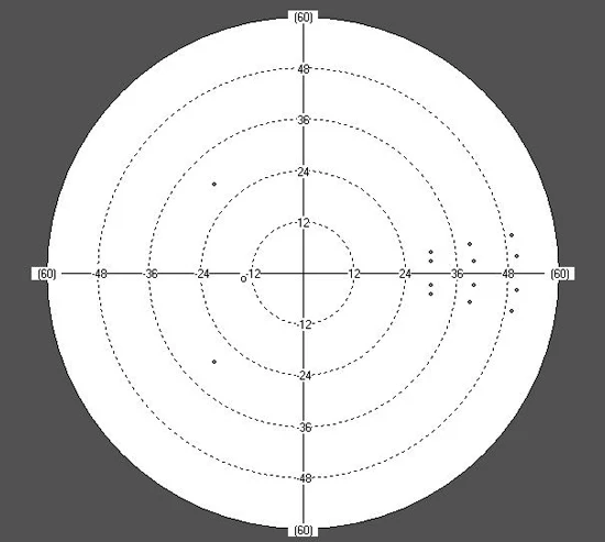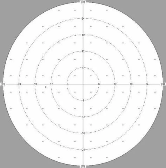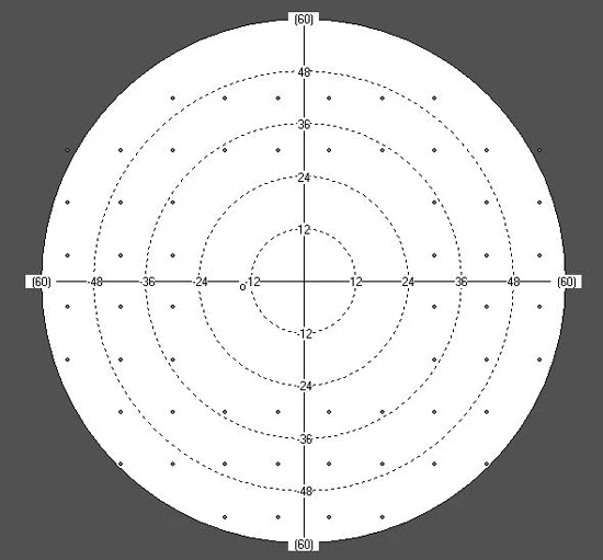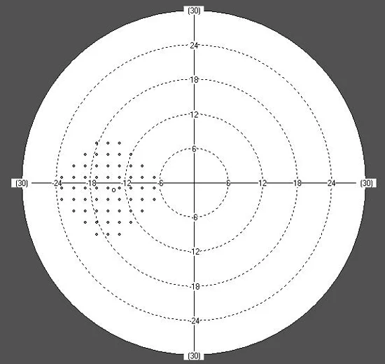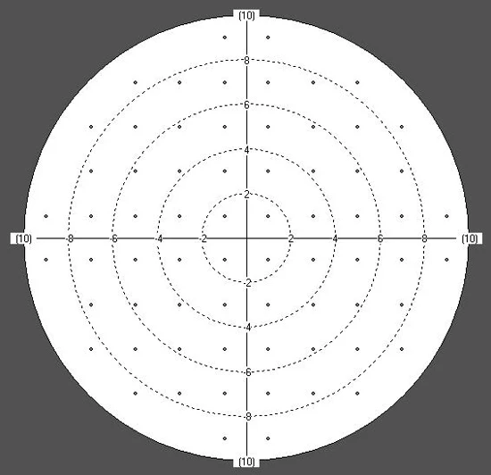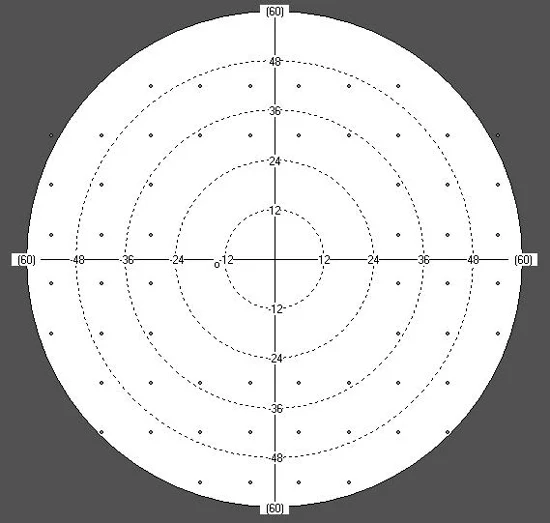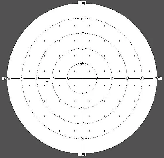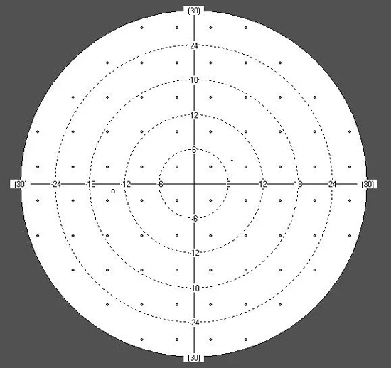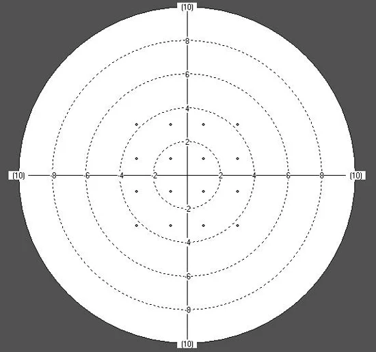 Comprobación del Ángulo de Visión Horizontal: Con el programa de Prueba Esterman, otra Comprobación del Ángulo de Visión Horizontal se utiliza para evaluar a conductores que tienen discapacidad visual en un solo ojo.