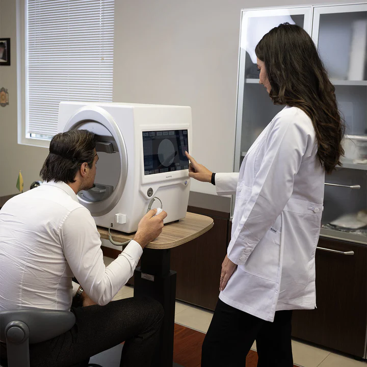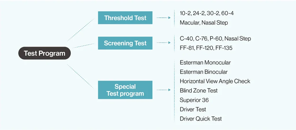 Principales aplicaciones: Prueba de cribado de campo visual completo, enfermedades de la retina, glaucoma, enfermedades del nervio óptico.