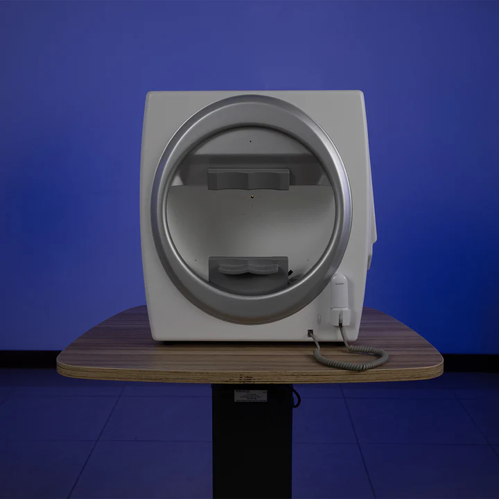 Este perímetro se adhiere estrictamente a los estándares Goldmann y utiliza un estímulo blanco sobre un fondo blanco para las pruebas de luz, siguiendo el método Goldmann.