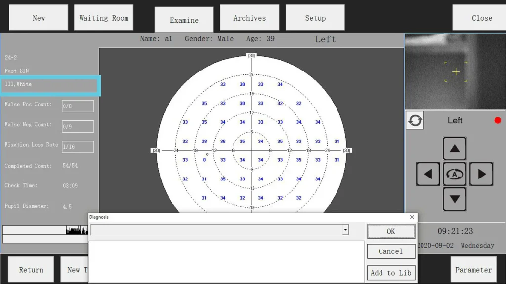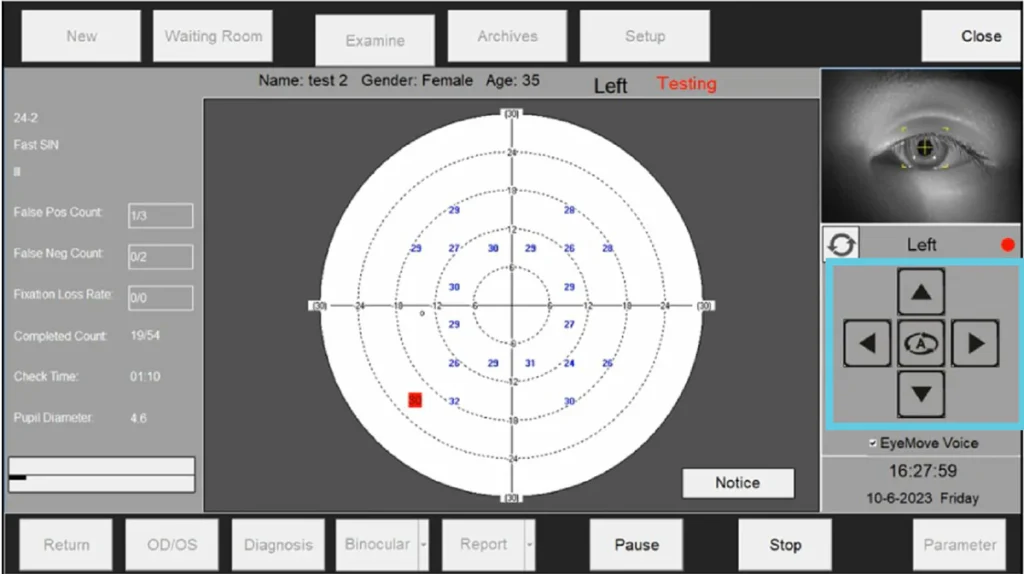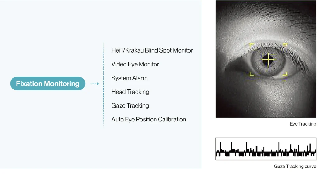 La función de Reconocimiento Automático del Ojo del sistema identifica automáticamente OD (ojo derecho) y OS (ojo izquierdo) y proporciona alarmas para alertar al operador. Esta funcionalidad sirve como un valioso mecanismo de protección contra errores durante el proceso de prueba.