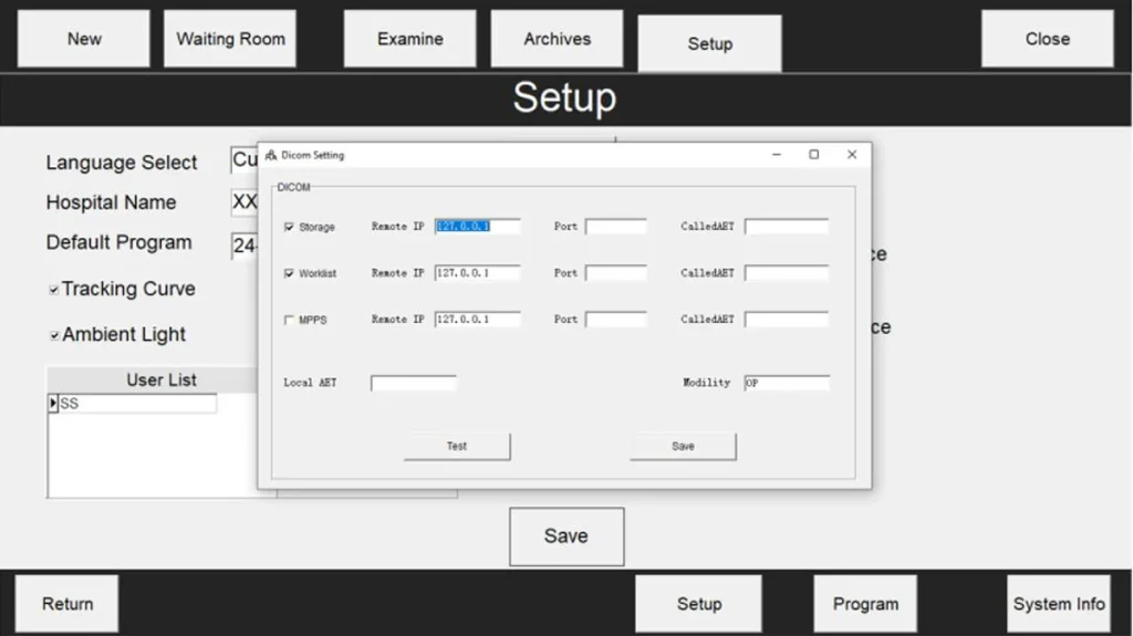 - Almacenamiento: El equipo convierte la imagen en una imagen DICOM, comunica a través de DICOM y la transmite al servidor PACS. Cuando se completa la inspección, el equipo cargará la imagen a través de la red del hospital. (Necesario)