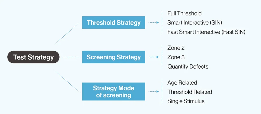 Las estrategias de prueba consideran plenamente diferentes grupos de edad, capacidad de respuesta y regularidad de defectos en el campo visual para proporcionar una solución más rápida para las pruebas de perimetría que sea inteligente, interactiva y perspicaz.